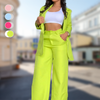 Costume deux pièces tendance de couleur unie pour femme : blazer et pantalon droit avec poches.