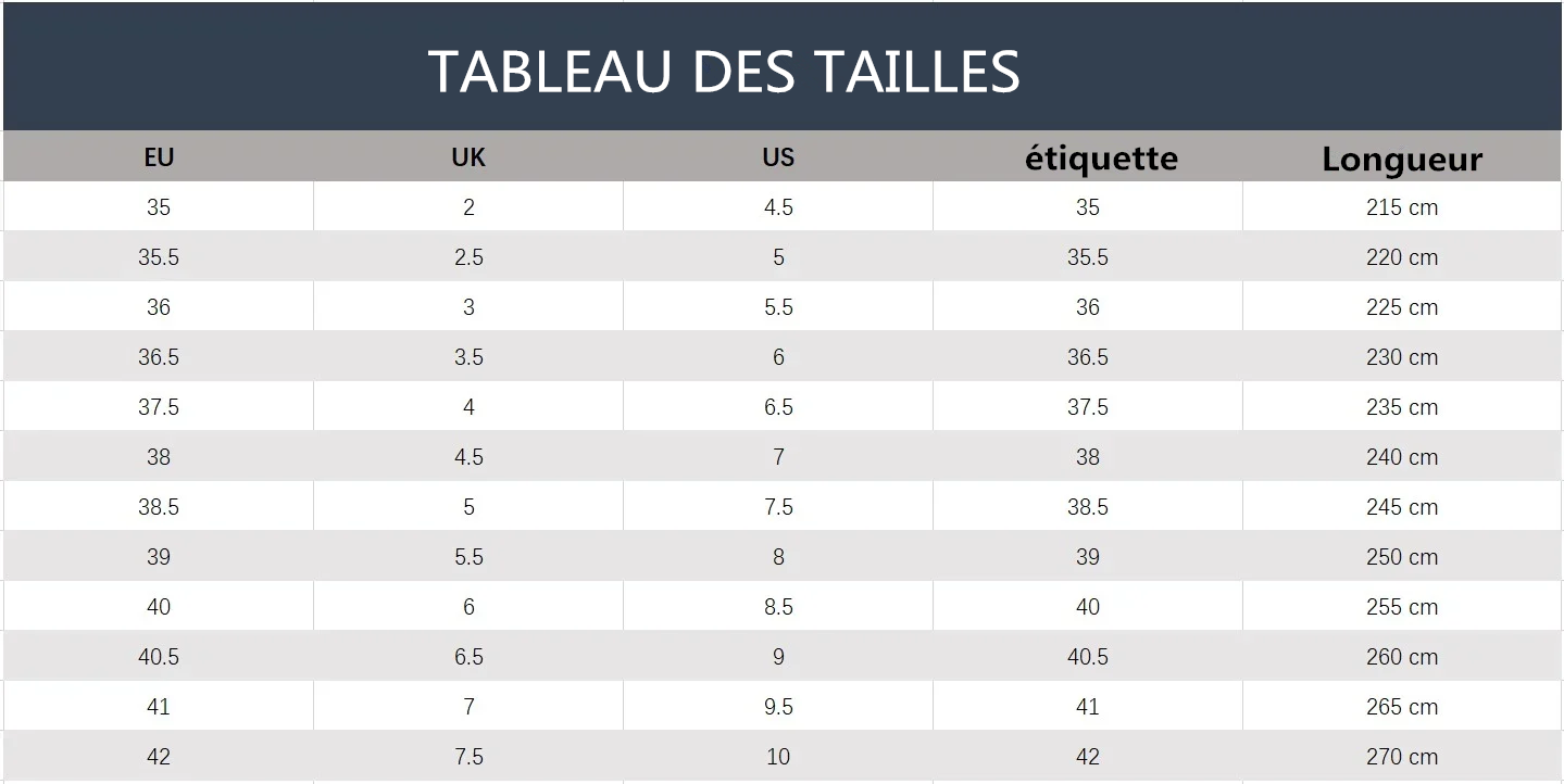 - Si vous avez un pied plus large, nous vous recommandons de prendre la taille supérieure, si vous avez un pied plus étroit, prenez la taille inférieure.
