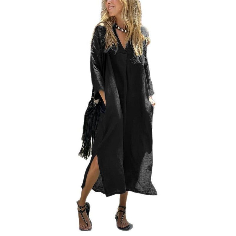 Robe longue décontractée pour femme avec col en V, poches et ourlet fendu