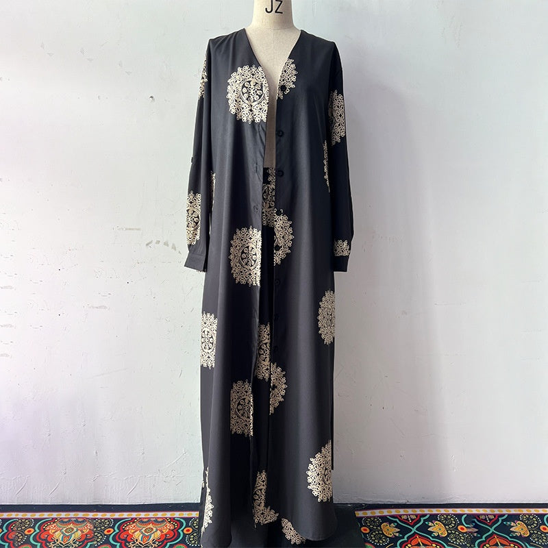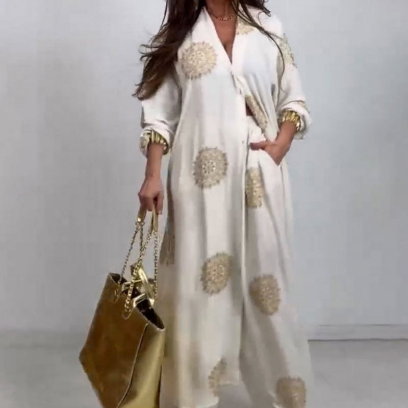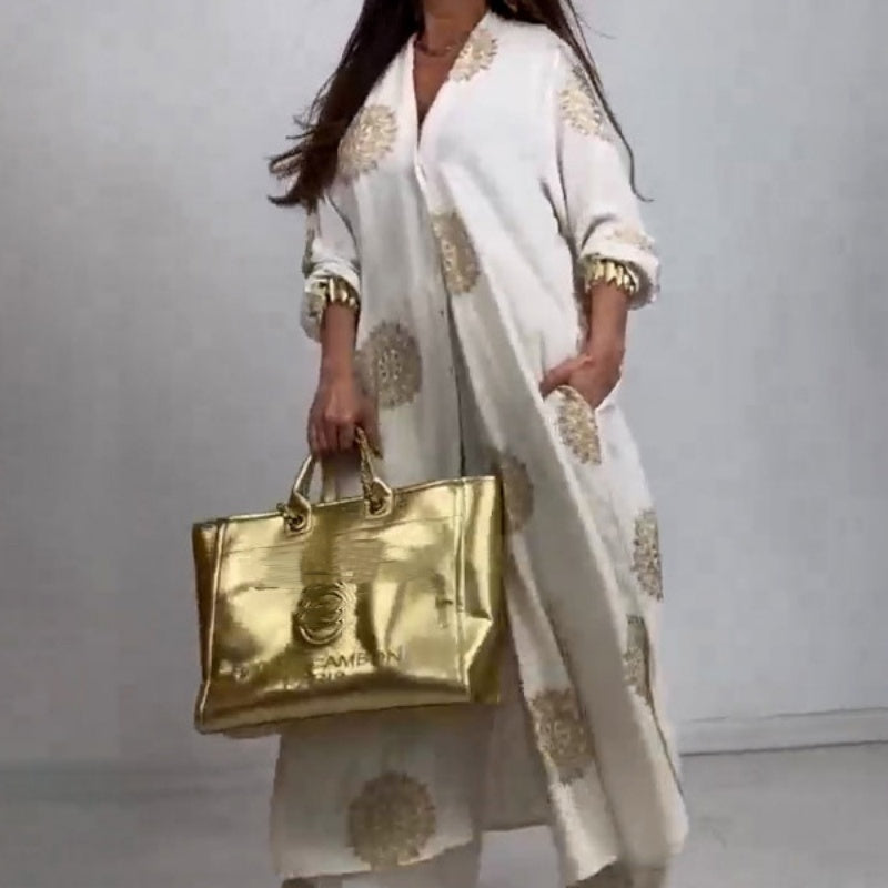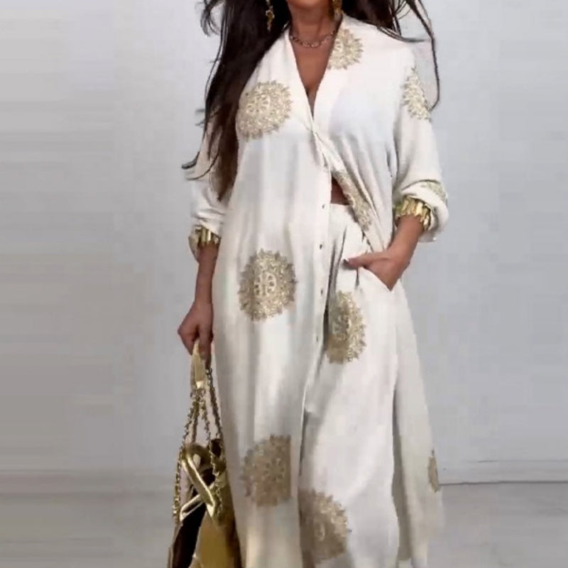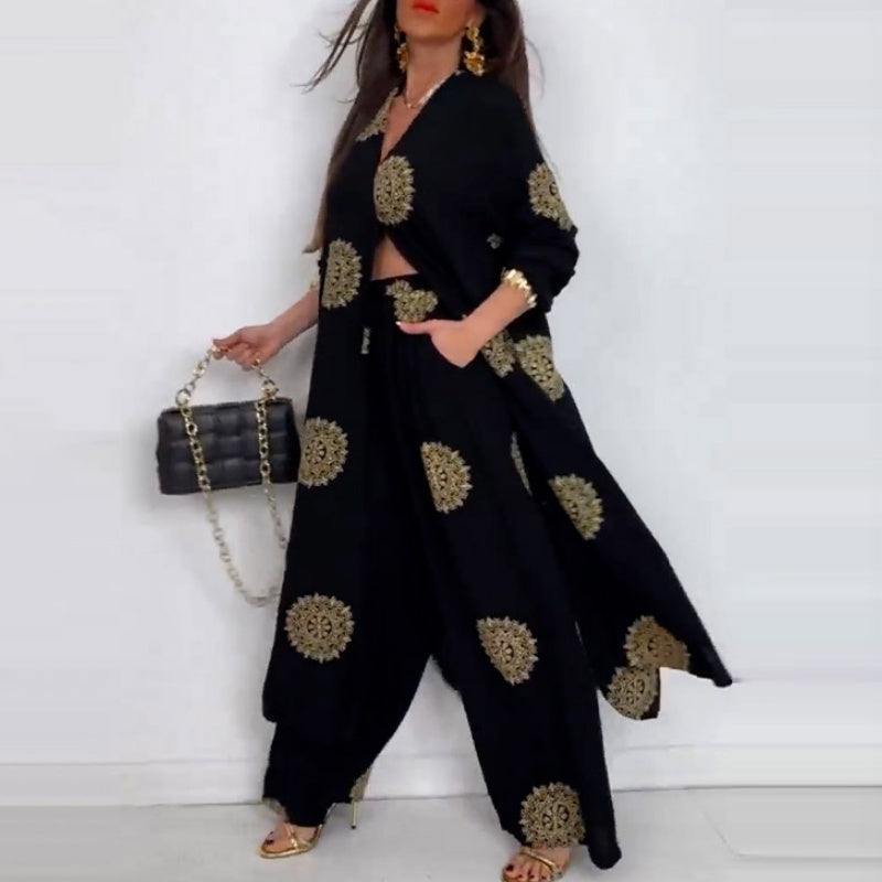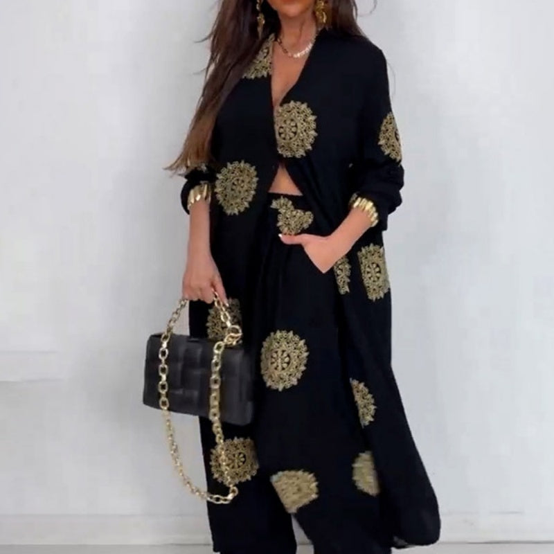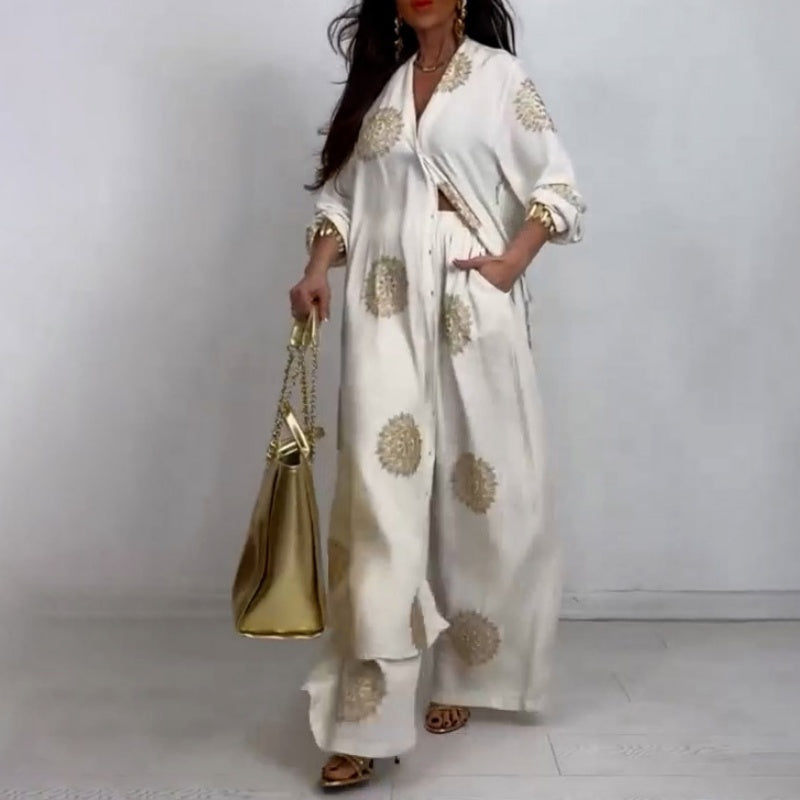 Ensemble deux pièces pour femmes comprenant un haut ample à col en V et un pantalon large imprimé