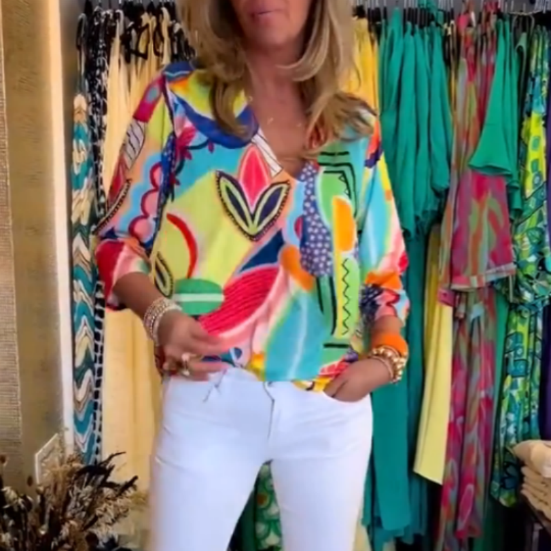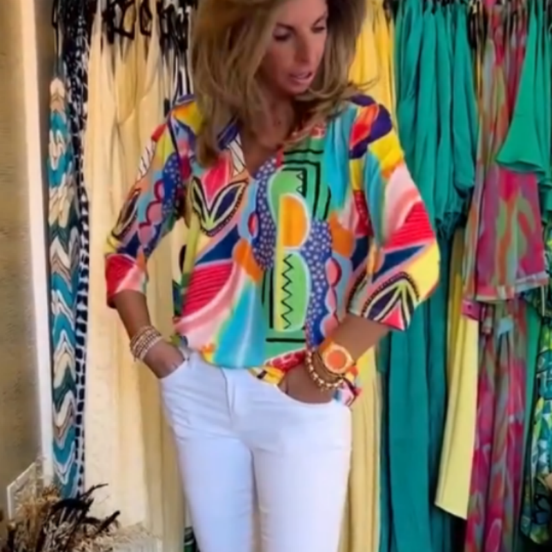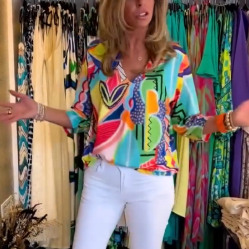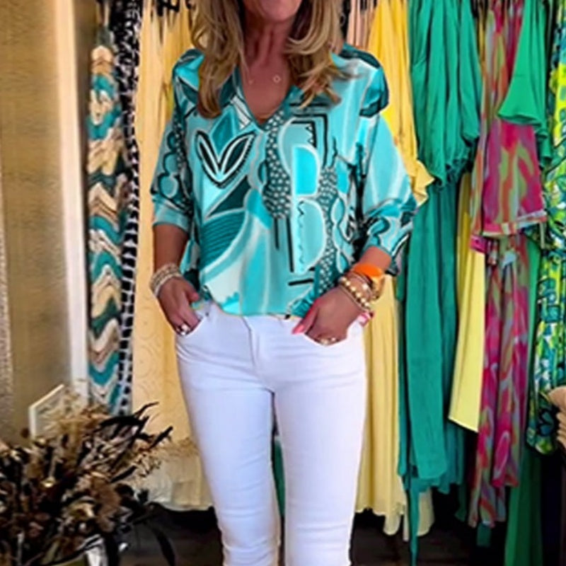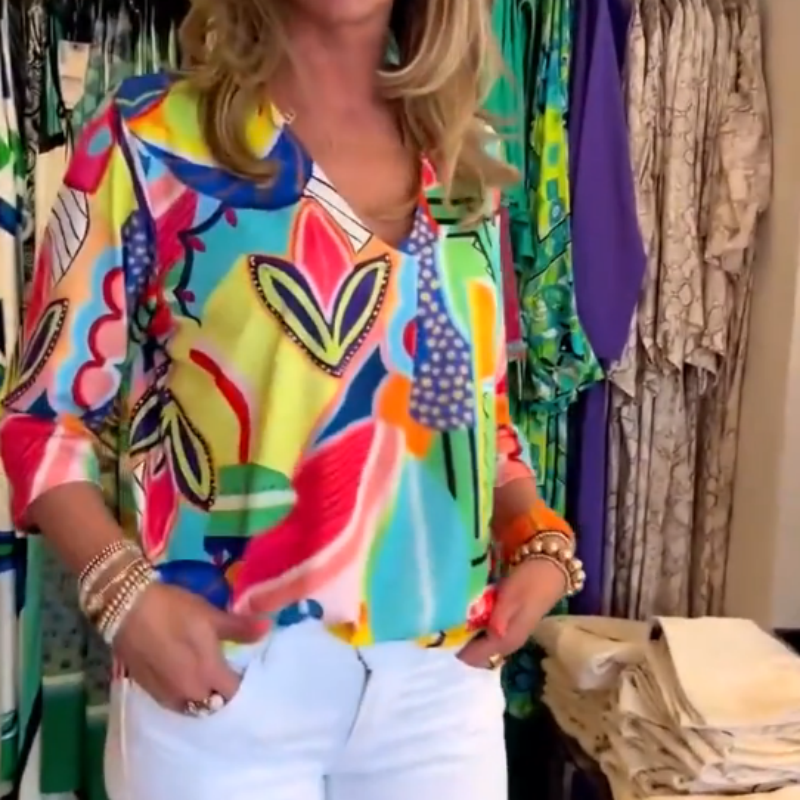 Contenu de la livraison : 1 x haut pour femme avec col en V et impression décontractée et tendance.